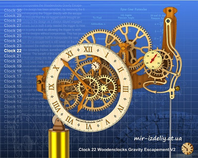 Часы-механизм 22 включают в себя Деревянные часы и тяжелый Маятник . На этот раз дизайн был упрощен, удалено 6 ножек вылов и привлечен триггер напрямую с ходовою колеса. Первоначально я думал, что шесть ножных углов принесут дополнительный уровень безопасности к конструкции и как всегда останутся в зацепление с спуском, но на самом деле это требуется только для спускового крючка, чтобы он двигался, чтобы часы, переходили в удар, что позволяет таким образом триггеру работать и непосредственно упрощает конструкцию без компромиссов. Это оказалось в случае с прототипом построенным включительно с новым триггером. Дизайн этого пускового механизма по-прежнему базируется на механизме Arnfield, он разработал метод, чтобы полностью изолировать маятник с релиза трения, то, что никогда не было достигнуто ранее. Преимуществом этого является то, что он уменьшает выработку, которая будет проходить в часовом механизме с течением времени. Этот новый дизайн стал более компактным, так что все действия на уровне глаз, когда на стене около 1500 мм от пола, в этом положении крупные передачи в трансмиссии можно увидеть над часами с спуском, со стороны такие действи четко видны. Шкив был построен в верхней части массы так, что бы часы могли работать в течение 12 часов на одном маятнике. Я использовал 3 кг свинца для маятника часов, но я подозреваю, что некоторые эффективности в моей зубчатой передачи, возможно сделаны немного больше, чем это действительно необходимо. Я экспериментировал с гравюрами на циферблате на прототипе, не пробовал с маршрутизатором CNC, но он работал очень хорошо. Я обычно использую Cut 2D для генерации кода обработки, но он не делает гравировку, поэтому я использовал ArtCAM Express, для гравировки диска, и он работал действительно хорошо. Я использовал миниатюрные шарикоподшипники для поддерживания всех валов, для уменьшения трения, и убедился, что пружинный привод может работать очень эффективно. Вы можете просмотреть детальные чертежи и увидеть всю конструкция часов в деталях.
