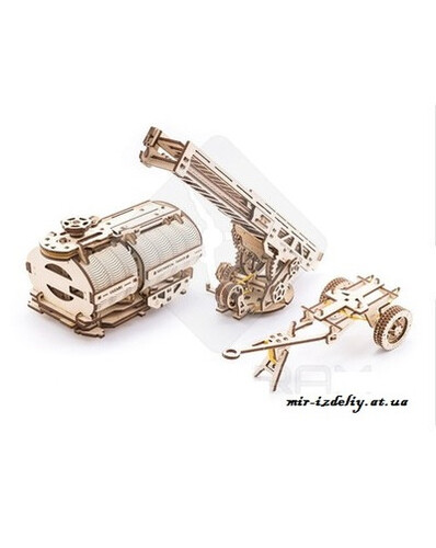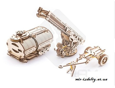Лестница имеет несколько элементов управления. Нажав несколько раз рычаг, вы можете поднять лестницу вверх. Рукояткой проворачивайте основание лестницы вправо или влево. Специальный храповик фиксирует выбранное положение. Покрутив вентиль, выдвигайте все три секции лестницы вперед. На конце лестницы есть крючок, который превращает ее в подъемный кран. Как и в большом прототипе, у пожарной машины UGEARS есть дополнительная маленькая лестница. Такая лесенка цепляется на основание большой лестницы, чтобы можно было взобраться наверх.