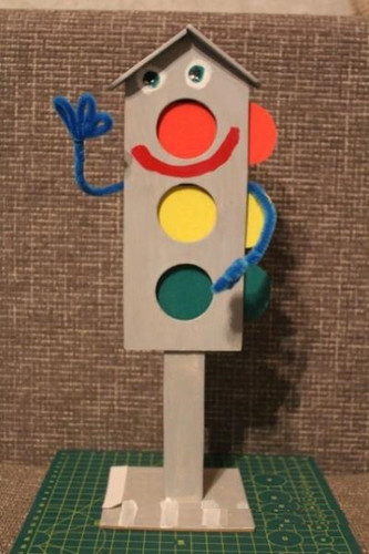 Дальше делаем с ним все, что душе угодно)– печальным, радостным, обычным. Мы планировали одеть семафор в полосатый шарф, однако малыш раздумал. В результате нарисовал глаза и приделал руки и …. . все. )))