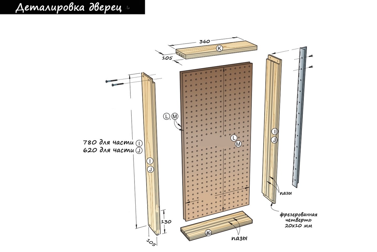 - По размерам из схемы из 6-мм оргалита вырезают панели L и M — 4 штуки для внутренней дверцы и 4 штуки для внешней.