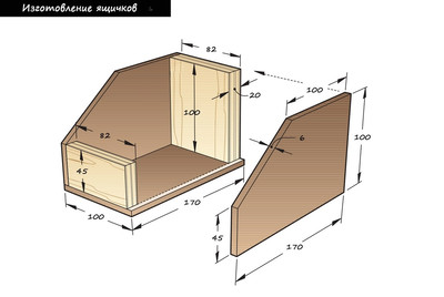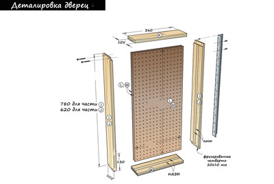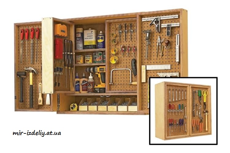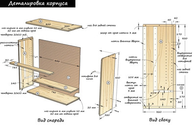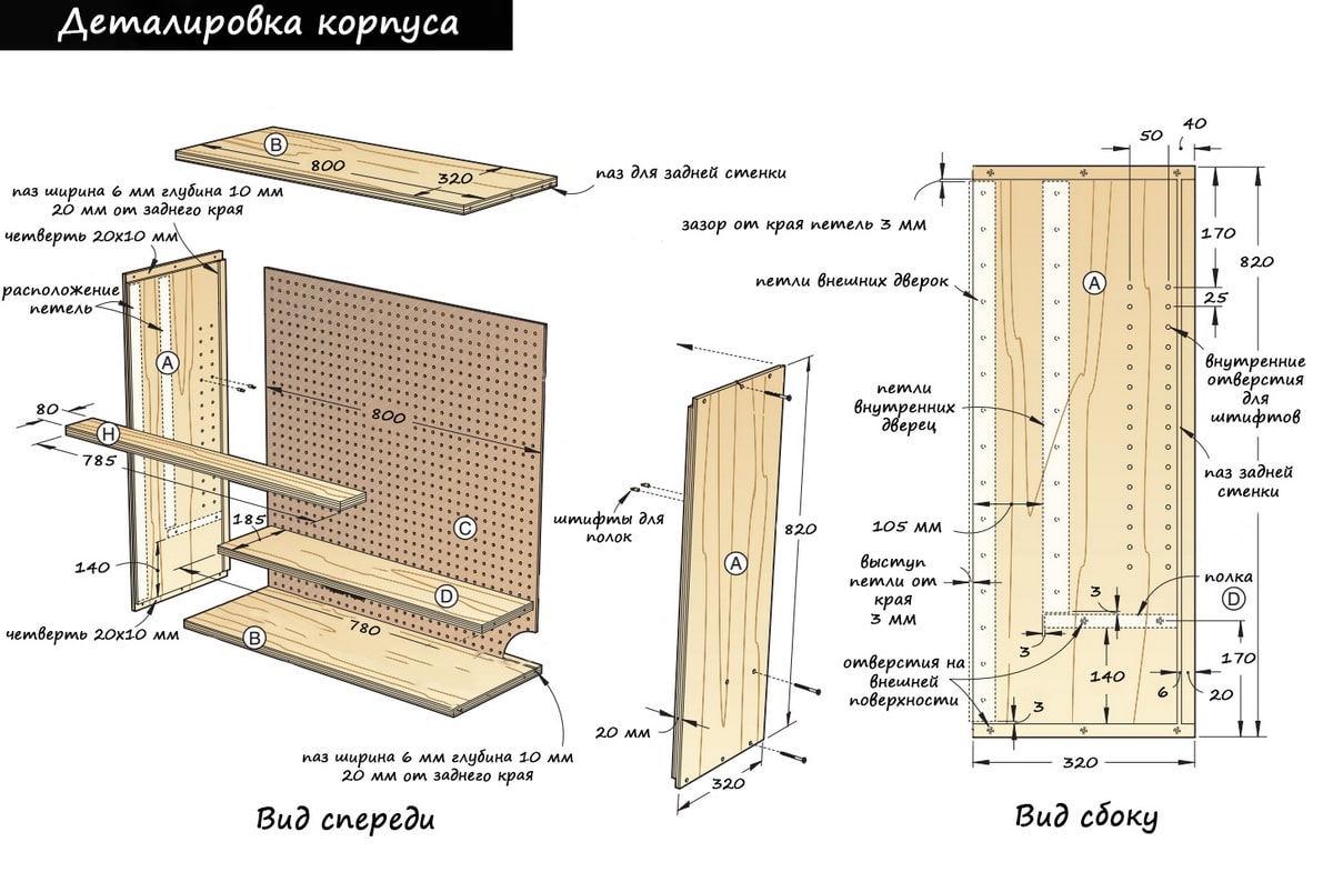 Шкаф состоит из нескольких базовых элементов: корпуса с полками, двух внутренних и двух внешних дверец, шести небольших ящичков. Рекомендованный материал — фанера толщиной 20 мм. Для изготовления задней стенки шкафа и панелей дверей используют перфорированный оргалит или тонкую фанеру толщиной 6 мм. Корпус и дверцы собирают с использованием простого соединения «в четверть».