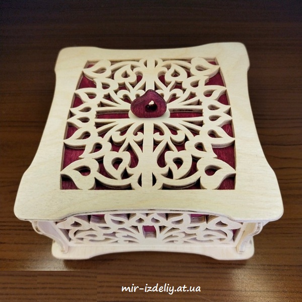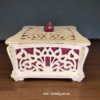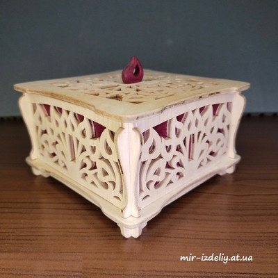 Пример отделки: Размер 12×12×7. Фанера 4мм. Внутренние стенки водной морилкой "бордо". Сама шкатулка без покрытия.