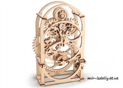 Одна из самых красивых моделей, таймер на 20 минут. Это механический хронометр, который можно выставить на нужное время от одной до 20 минут. Если завести механизм оповещения, то по прошествии времени раздастся звук. Таймер имеет необычный роликовый маятник и ручку регулировки амплитуды, которая находится на задней стенке. Работает от обычной канцелярской резинки.