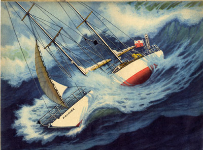 Ни буксировка троса, ни лежание в дрейфе не дали должного эффекта. Яхта трижды опрокидывалась, хотя приняты были все меры. Тогда Барановский решается на последний, непроверенный, способ — идти вперед на фордевинд на полной скорости. И тут достоинство быстроходной яхты оборачивается для нее недостатком. Оказавшись на склоне волны, «Полонез» Стремительно выходил на глиссирование и со всего хода врезался в подошву идущей впереди горы-волны. От резкого торможения возникала опасность перевернуться через нос.