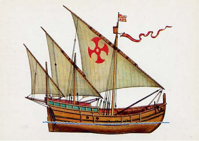Каравелла — сравнительно небольшое судно водоизмещением не больше 200—400 тонн, с более пропорциональными, чем у каракки, соотношениями главных размеров, более быстроходное, однопалубное, с высоким полубаком для защиты от волн. Она имела три мачты, из которых фок-мачта была с прямым парусом, а остальные — с латинскими. Каравеллы не были, подобно караккам, специальными торговыми судами. Обладая хорошими мореходными качествами, они широко применялись испанцами и португальцами для плаваний с целью открытий в Атлантическом океане.